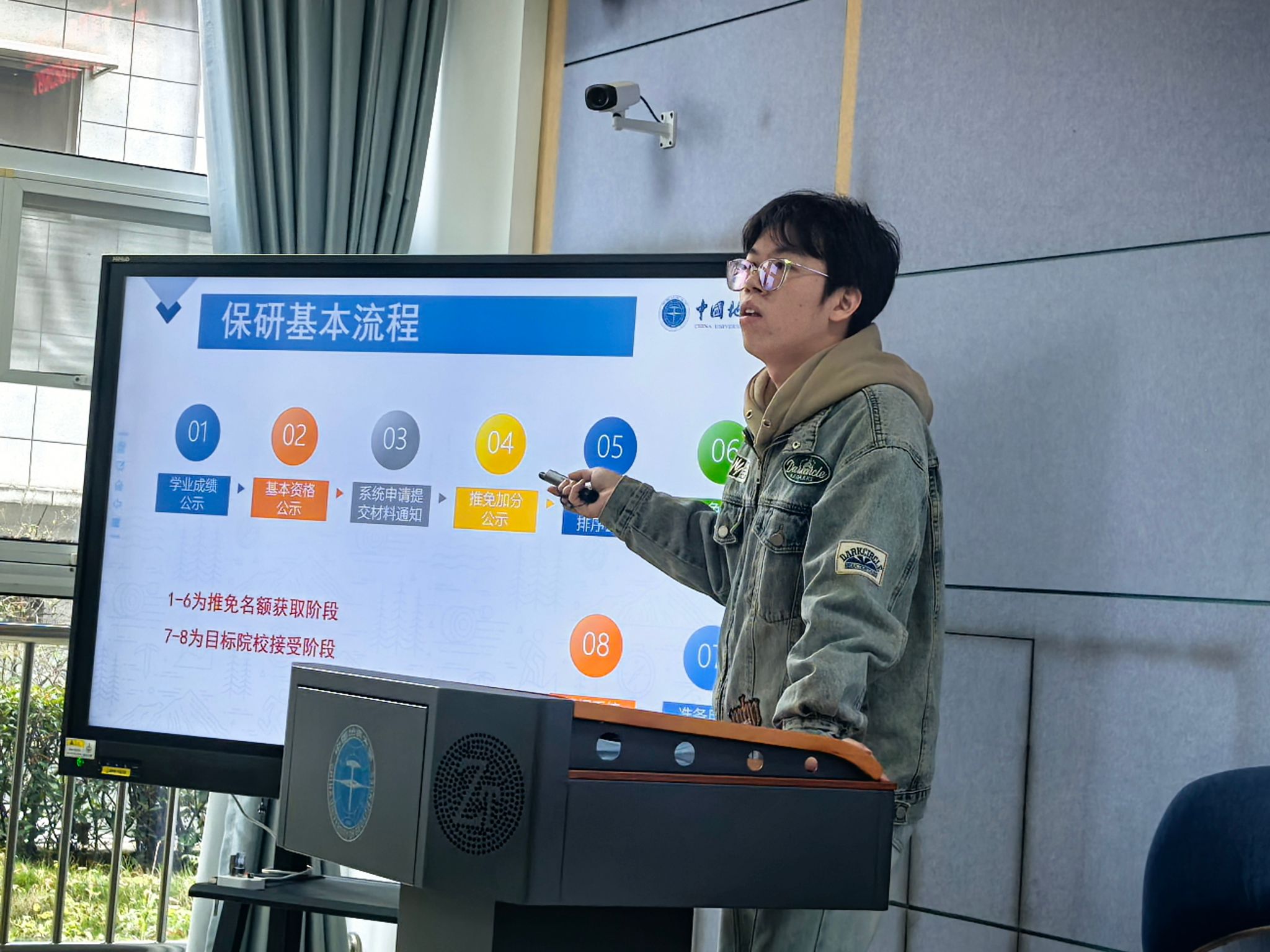 2022级本科生石骏鹏介绍推免政策。他详细介绍了推免的途径和要求,并结合自身经历,分享了保研经验和注意事项。