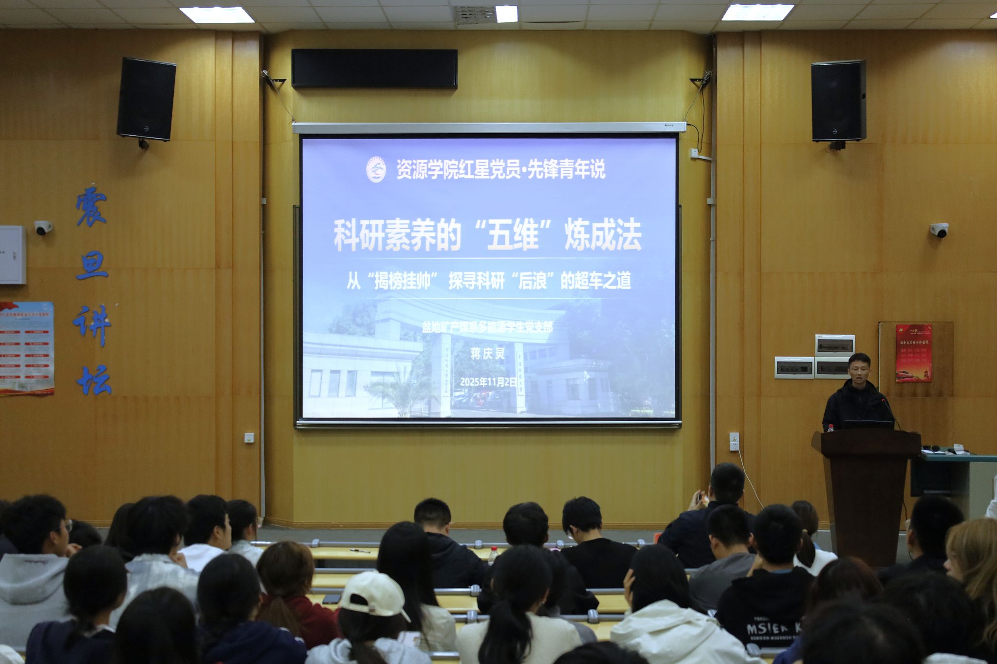 2025年度中国青年科技创新“揭榜挂帅”全国一等奖团队骨干成员、盆地矿产煤系多能源学生党支部蒋庆灵,介绍了“科研素养的‘五维’炼成法”。他结合结合“揭榜挂帅”备赛历程、比赛感悟和成长收获,建议大家在本科阶段要培养从“看见”到“看懂”的地质思维观,拥抱交叉学科,打好学科专业基础。他通过讲述赛前利用Al学习科研软件、机器学习、修改代码、数值模拟等案例鼓励同学们要善用AI赋能,提高科研效率,并从团队的视角强调了“1+1>2 的科学与艺术”团队协作的重要性。最后,他谈到在本科阶段的科研素养培养,是一个从“接收知识”到“创造知识”的渐进过程,要充分利用学院、学校的平台实现自我的成长与突破!