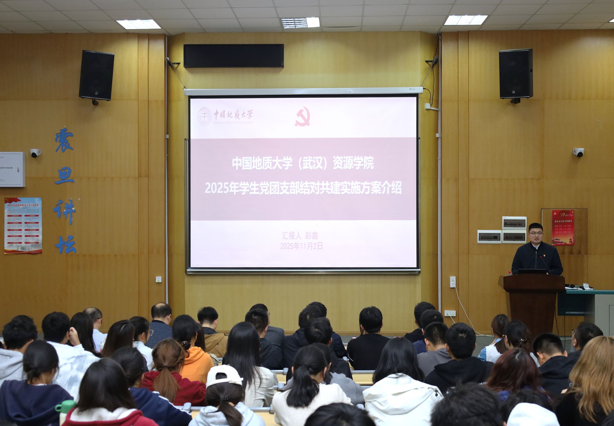 (通讯 何韵冰 彭鑫 | 摄影 张少龙 路宇焜)为充分发挥学生党支部的战斗堡垒和示范引领作用,切实帮助本科新生团支部提升组织活力、解决成长困惑,2025年11月2日,cos成人视频 在教三楼109教室举办2025年党团支部结对共建示范主题党日暨红星党员先锋青年说活动。研究生工作部部长许德华、校团委副书记刘明辉,cos成人视频 党委书记汪再奇、党委副书记谭文伦,教师党建指导员李前、张恒、伏海蛟、赵江南,学生党建办公室主任彭鑫、辅导员陈宇、兼职辅导员张少龙,以及学生党建工作办公室负责同学、结对共建学生党支部书记和2025级全体本科团支部同学共同参会。会议由彭鑫老师主持。