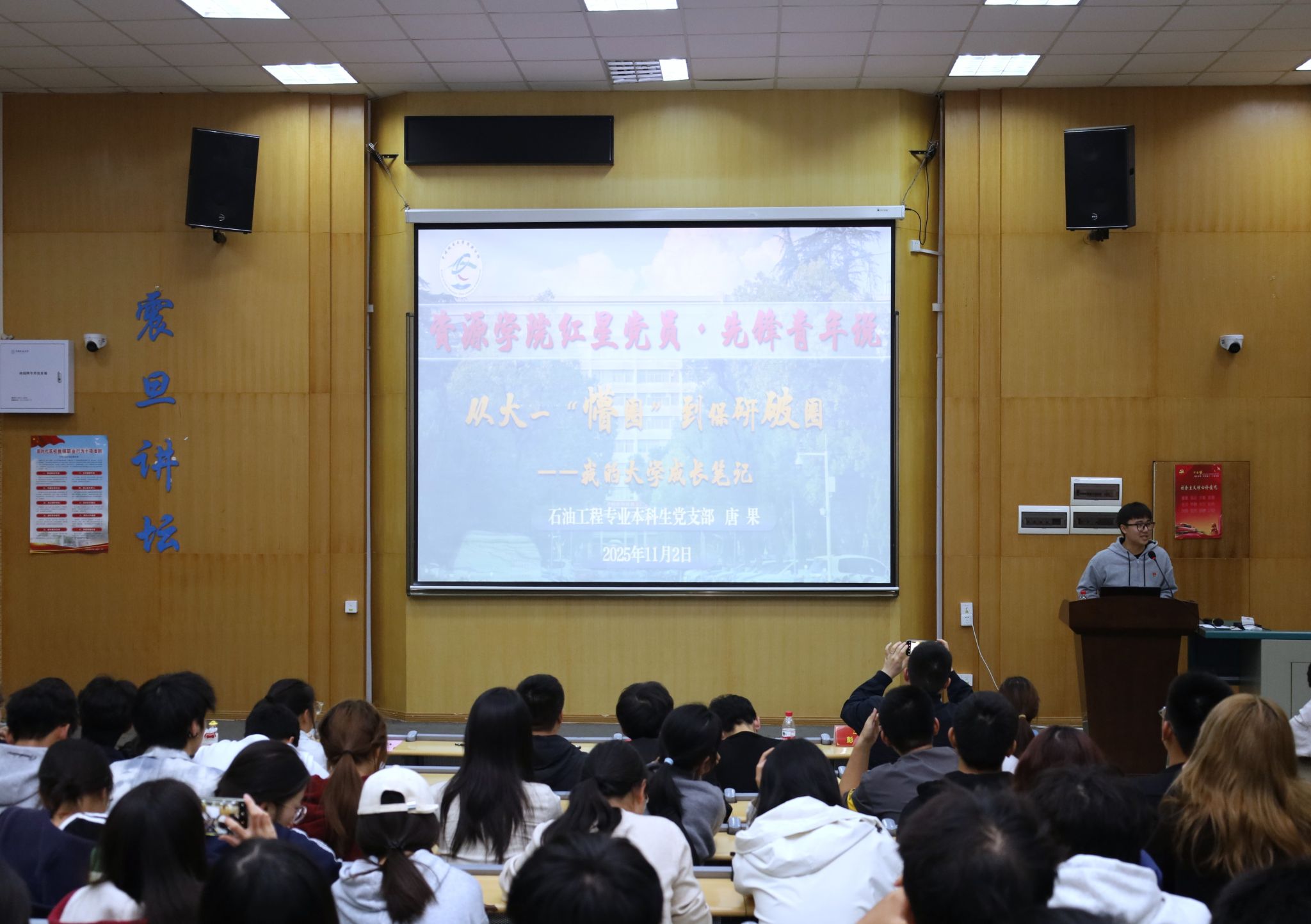 第十四届“挑战杯”全国银奖、2025年国家奖学金获得者、油气开发地质研究生党支部高旭东,以“怀能源报国之心,做勇攀高峰之人”为题从先锋示范、志愿服务、社会实践、科研攻关等四个方面分享了自己科创成长故事,鼓励不必畏惧探索荆棘,唯有扎根专业、勇于实践、敢于创新,方能为国家能源安全筑牢屏障,让青春在报国奉献中熠熠生辉!